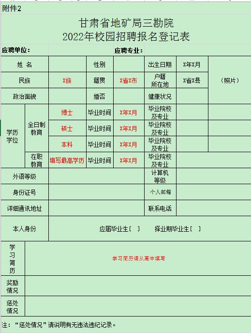 附件2: 甘肃省地矿局三勘院2022年校园招聘报名登记表